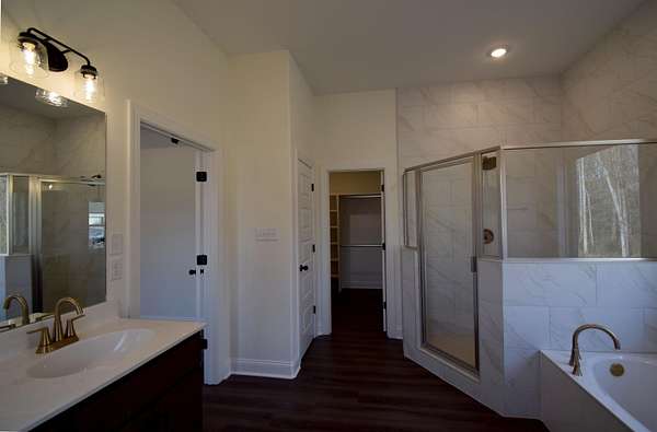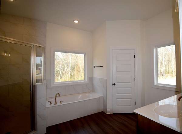 The Robin is a beautifully designed two-story home that blends timeless architecture with modern living. Its brick exterior, clean rooflines, and inviting covered entry give it classic curb appeal while maintaining a fresh, contemporary feel. Inside offers thoughtfully arranged living space with 5 bedrooms, 3 full bathrooms, and a 2-car side load garage. The main level is anchored by an open-concept family room, dining area, and kitchen. The kitchen features abundant cabinetry, generous counter space, and a central island that ties the space together. The primary suite is located on the main floor, providing a private retreat complete with a spacious bathroom and walk-in closet. 2 additional bedrooms downstairs featuring split floor plan. Upstairs, you'll find additional bedroom, bonus and a full bath. Covered rear patio situated perfectly for privacy and nature watching.