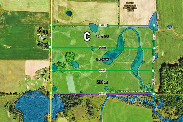 Encompassing approximately 19.76 acres along S Deer Lake Road, this proposed Parcel C presents a rectangular tract defined by depth, proportion, and open ground. The configuration offers a consistent footprint from frontage to rear boundary, allowing the full span of the acreage to be experienced across the property. Broad stretches of open land are complemented by scattered natural growth, creating a balance between cleared acreage and organic landscape features. A naturally occurring wet area is present within the parcel, contributing variation across the terrain. Electric service is available at the road. This parcel is part of a proposed land division and remains subject to township approval and final survey. Boundary lines shown are conceptual and for illustrative purposes only.