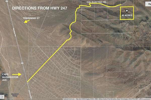 PRICE REDUCED! Giant 39.4 Acres of Raw Land near Accessible Dirt Road. South of Barstow, and East of Highway 247. A Beautiful and Completely Peaceful & Private Area for a Person Who Would Like to Get Away From it All, But Still be Close to Civilization. Wonderful Place to Build a Single Family Ranch Home, Use for Recreation, Raise Horses, Lodging, Grow Agricultural Crops, and a Variety of other Uses for RC Zoning! Topography is Mountainous so Excellent Spot for Hunting, Off Roading, Camping & Hiking! Owner is Willing to Carry Seller Financing With Only $1,000 Down and Flexible Terms!! Great Investment Opportunity! Parcel Dimensions 1,329 Feet x 1,261 Feet. San Bernardino County APN # 0417-043-09. Cal Electric Road Turnoff is on Hwy 247 About 1.4 Miles North of the Slash X Cafe. Possible Windmills and Solar Location!(High Tension Power Lines Adjacent Property for Connecting to the Grid!)