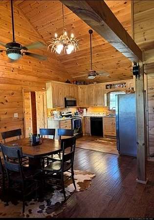 Log cabin home situated on 2.06 acres in Caney, OK. This 1,902 sq ft property features 4 bedrooms and 2.5 bathrooms, with 2 bedrooms located downstairs and 2 additional bedrooms upstairs, including a half bath in an upstairs bedroom. Extra storage is available in all bedrooms. The home offers an open kitchen and dining area, a living room with fireplace, and a full laundry/mud room. Warm cabin character with open space and privacy, ideal for country living.