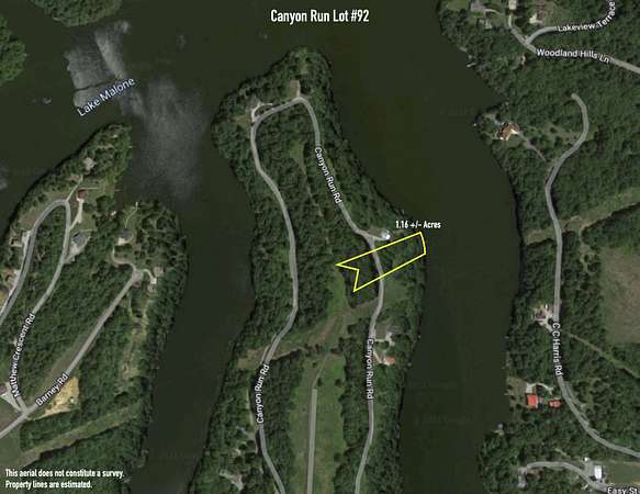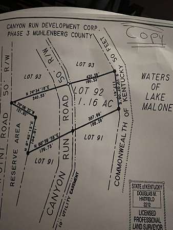From Shady Cliff Marina take Lake Malone Road north. Turn right on Whites Carver Road then left at the 2nd entrance to Canyon Run. Lot will be lakeside.