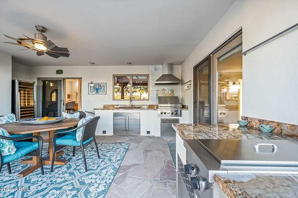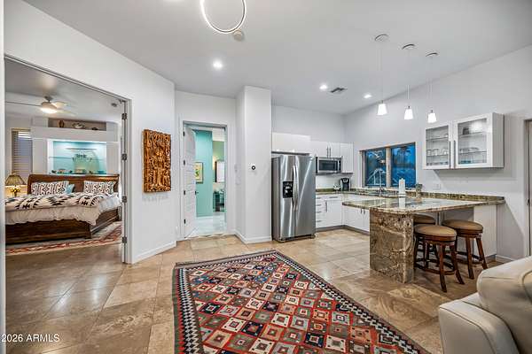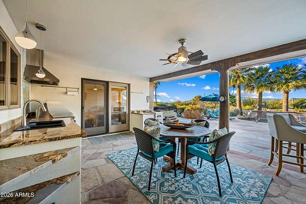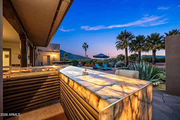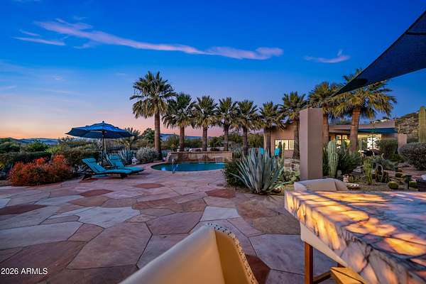 Set in the heart of Carefree, this exceptional estate offers a private desert sanctuary where timeless design, modern comfort, and resort-style living come together seamlessly. Positioned on a sprawling 1.6-acre lot, the property is framed by sweeping mountain views and expansive desert vistas, delivering breathtaking sunrises and glowing sunsets that transform each day into a memorable experience. Impeccably manicured grounds feature mature desert gardens and soaring palm trees, creating a tranquil yet impressive setting ideal for both intimate moments and large-scale entertaining. Designed with hosting in mind, the outdoor living spaces center around an inviting pool, generous lounge areas, and a fully equipped outdoor kitchen - perfect for sunset gatherings, celebrations with family and friends, or relaxed evenings under the desert sky. The home has been thoughtfully and completely remodeled to preserve its original character while incorporating refined, modern finishes throughout. A private guest casita just steps from the pool offers ideal accommodations for visitors, while the primary suite is a true retreat, complete with a spa-inspired bath designed for rest and rejuvenation. With no HOA, exceptional privacy, and a peaceful, quiet setting, this remarkable property offers a lifestyle defined by elegance, space, and effortless entertaining in one of Carefree's most desirable locations.