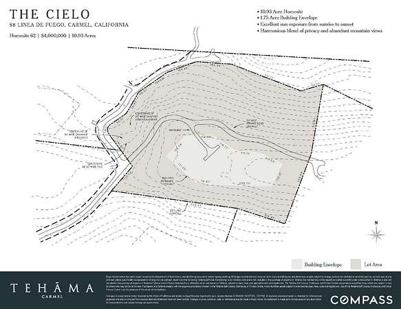 The Cielo - In the exclusive Tehama community envisioned by Clint Eastwood is The Cielo, a 10.93-acre property elevated high atop the peninsula with stunning vistas of the Santa Lucia Mountains to the south and the forested canyons and hillsides of Tehama to the west. Framed by privacy-enhancing oaks and pines, The Cielo is immersed in all-day natural light due to its southern-facing position. While mostly level, the 1.75-acre building envelope rises slightly up the hillside along its easter edge, affording discretion for crafting a home that enjoys dramatic sunset views toward Carmel Bay and Point Lobos. Be among the few to reside in a coveted locale marked by a thoughtful vision of sustainability. Homesite owners enjoy Tehama social membership (subject to dues, fees & rules/regulations), including dining, fitness center, tennis and swimming pools. Located in the highly rated Carmel School District, Tehama has secure, gated entrances and is minutes from both Carmel-by-the-Sea and Monterey.