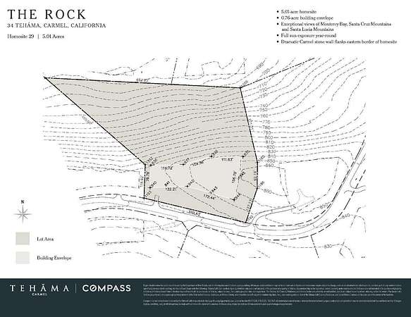 THE ROCK | Lot 29 MLS In the exclusive Tehama community envisioned by Clint Eastwood is The Rock, a beautifully secluded 5.01-acre property sited on a high crest above the wooded canyon with views of Monterey Bay, the Santa Cruz Mountains and the Santa Lucia Range, and more immediate vistas of the Tehama Golf Course, Clubhouse and Fitness Center. The 0.76-acre building envelope is bordered by a dramatic cut of Carmel stone topped with tall Monterey pines, affording the owner discretion to integrate the home directly into the stone or allow it to serve as a decorative element enjoyed from within. Be among the few to reside in a coveted locale marked by a thoughtful vision of sustainability. Homesite owners enjoy Tehama social membership (subject to dues, fees & rules/regulations), including dining, fitness center, tennis and swimming pools. Located in the highly rated Carmel School District, Tehama has secure, gated entrances and is minutes from both Carmel-by-the-Sea and Monterey.