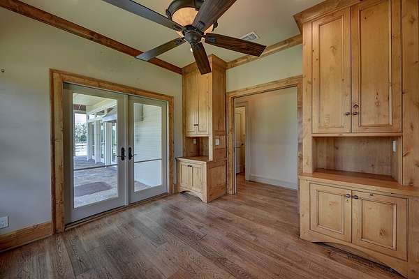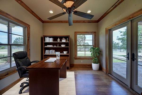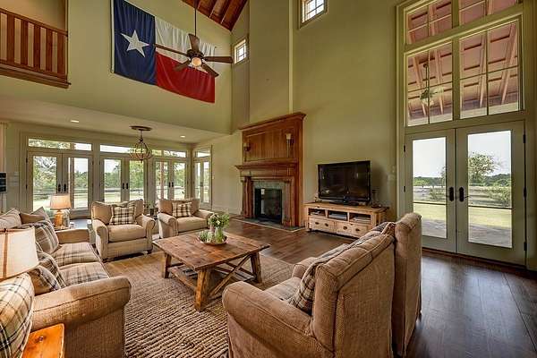 The spacious living room is highlighted by a custom built wood mantel surrounding the gas log fireplace and large windows that flood the space with natural light and offer breathtaking views of the surrounding countryside. Eight French doors lead out to a covered patio, ideal for morning/evening coffee while enjoying the sunset.