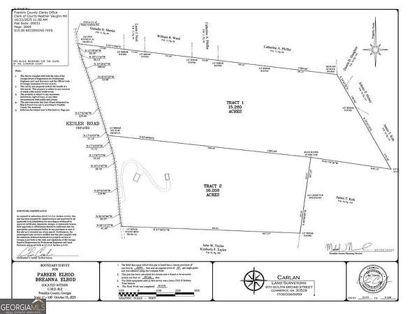 15-acre tract on Kesler Road in Franklin County, offered at $240,000. This newly surveyed and recorded parcel is part of a larger 25-acre property and is zoned AR1 (residential/agricultural), offering flexibility for a private homesite, mini-farm, or future investment. The tract may be subdivided further, per county guidelines. The property features approximately 509 feet of road frontage, rolling topography, and a potential homesite near the road where a driveway could be established. The land will require clearing. Power is available at the road. A well and septic system would be required. No HOA and no known covenants or restrictions. Mobile homes are permitted. RVs and campers may be stored on the property; county regulations require an active building permit for occupancy. A small creek runs along the back corner of the property, while the remainder of the acreage is usable. The land offers year-round flowing spring water, mature white oaks and hardwoods, and abundant wildlife, providing a peaceful, natural setting with privacy and space. A recent survey has been completed and corners are marked. Buyer to verify zoning details, permitted uses, and utility requirements.