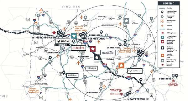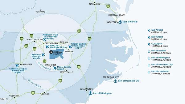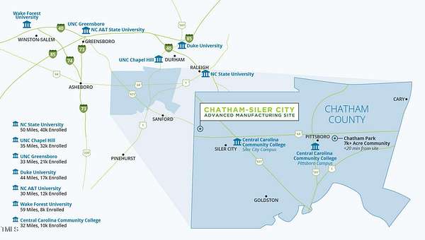 1,326 Acres Zoned for Heavy Industrial Use in the Chatham-Siler City Advanced Manufacturing (CAM) Site This site is a development-ready, North Carolina Certified Site located in central North Carolina, strategically positioned along the NC Carolina Core and in close proximity to the future Interstate I-685. The Chatham-Siler City Advanced Manufacturing Site boasts access to a workforce exceeding 1.4 million individuals within a 50-mile radius. Notably, this property adjoins the Wolfspeed John Palmour Manufacturing Center for Silicon Carbide, which is set to become the world's largest facility for Silicon Carbide manufacturing. Additionally, it is only 17 miles from the Toyota Battery Manufacturing Facility in Liberty and is conveniently located near the Siler City Municipal Airport. Rail service is also available to the site. THIS PROPERTY IS AVAILABLE FOR PURCHASE AS A WHOLE OR IN SMALLER PARCELS, WITH PRICING VARYING BASED ON LOCATION AND ACREAGE. PLEASE CONTACT THE LISTING AGENT TO DISCUSS SPECIFIC NEEDS. Do not miss this exceptional opportunity!