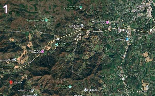 From Franklin, West on US-64 for 6 miles Left onto West Old Murphy Rd for 1/2 mile Right on West Dills Creek Rd Mirror Lake on right in .8 miles Right on Crestline Drive Follow to arrows and the sign at beginning of property