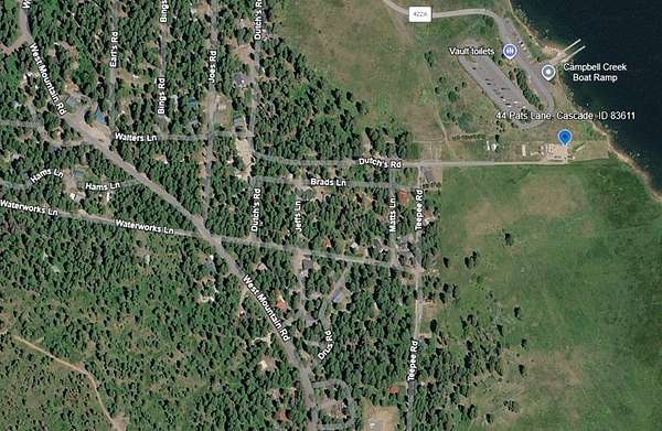 Hwy 55 (Main Street) in Cascade, West on Lake Cascade Parkway, Left on Lakeshore Drive, Right on West Mountain Road, Right on Waterline, Left on Matts Road, Right on Pats Lane through gate into meadow past small home to property on left. Please close gate each time thru if cows are in vicinity.