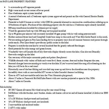 ONE OF KIND LAKE CASCADE PROPERTY! 1+ ac true waterfront at high water mark with potential to build up to 3 homes! Borders national forest and ranch land. Arguably the best views on the lake. On a clear day you can see across the water to Tamarack, Brundage, Sugarloaf, Jug Handle, Eagle Nest, eastern range and the grand backdrop of West Mountain behind you. Front row seats to the spectacular Cascade 4th of July fireworks. 90 gpm well. 800 amps power. Driveway and one pad site already in. 4 bed septic system already installed and 2 more septic systems approved & permitted. Compare with other "one home only" lake properties similarly priced - generally on tiny 1/5 to 1/4 ac lots sandwiched in-between other homes. This unique property offers a once in a lifetime opportunity to create your own private legacy retreat OR family compound for the generations! Sale includes just about everything you need to live on site year-round while you build - 2017 38' Cameo 5th wheel, 843 bobcat, 2 hickory storage sheds and more! (See Features Sheet for complete list) No CCR's No HOA! The adjoining property with cabin also available - buy it too and you own it all - Lock, Stock and Barrel! Owner/Agent