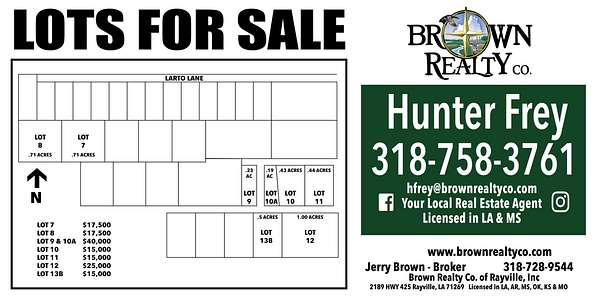 A unique opportunity to own a piece of paradise! Seven lots for sale on Cassels Acres Rd in Jonesville, Louisiana, each just minutes away from the fabulous Larto Lake. These lots are ideal for anyone looking for a perfect campsite to enjoy fishing in Larto Lake and hunting in the nearby Wildlife Management Area. Lot details: *Lot 7 - $17,500 *Lot 8 - $17,500 *Lot 9 and 10A(combined) - $40,000 (includes 6 camper hookups, water, and sewer on-site) *Lot 10 - $15,000 *Lot 11 - $15,000 *Lot 12 - $25,000 Lot 9 and 10A will be sold as one with the added benefit of 6 camper hookups, water, and sewer already installed. All other lots have water and electric nearby, providing easy access to utilities. Deeded access to all lots is provided through easement roads, ensuring convenience and privacy. Don't miss out on these incredible lots near Larto Lake!