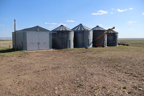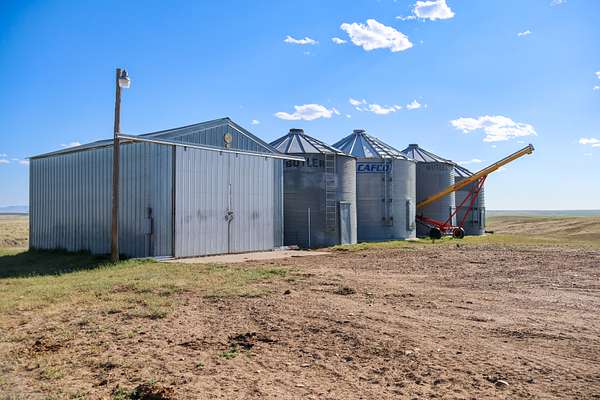 ImprovementsSteel grain storage with select bins featuring aerationSmall set of working corralsModest utility shopPower available at the building site