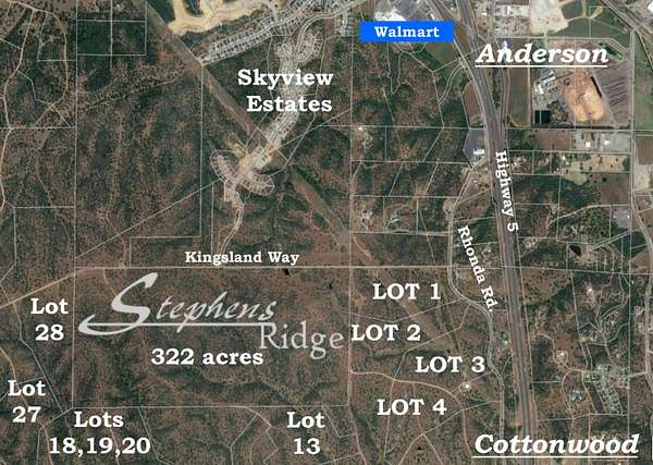 Northern California Country Lifestyle at the southern border of Anderson and on the northern edge of Cottonwood convenient to Highway 5, schools, and amenities. Anderson Wal Mart super store is a mile and a half north of Rhonda Rd. and South 2 miles to Cottonwood Holiday Market. Build that dream home with ample room for hobby farming, 4H and shop of your size. Property is level to rolling, dotted with massive Oaks and numerous ponds and seasonal creeks with graded gravel roads. This specific lot is off the power grid, PG&E Power source is over a mile away. Easements for PG&E power along Kingsland Way is situated just NW off Davidson Rd. which is a fire exit and 4404 feet to Rhonda Road. The zoning allows for one residential dwelling per 40-acre parcel. This 40-acre specific parcel is fenced all but 1600 feet. This is a picturesque rural community with multiple 40 plus acre parcels ranging from $110,000 up to $895,000 for a 322-acre parcel. Wells in the area report good production, perc location identified by past survey. Property is designated 'Open Range' current use is winter pasture for cattle. Area is completely fenced and secured by multiple locked gates for property owners' access, security and enjoyment.