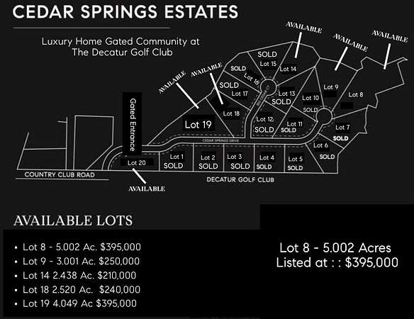 NEW LUXURY HOME GATED COMMUNITY IN DECATUR, TEXAS : Welcome to Cedar Springs Estates located on the Decatur Golf Club. Exclusive Custom Home Sites available for purchase starting at $200,000. Cedar Springs Estates offers a selection of unique amenities including direct access to the Decatur Golf Club and Club House, across the street from Hollis & Sue Jones Park and ball field's, as well as very close proximity to the Decatur Private Airport. Rest assured with extra level of security behind the community gates, Cedar Springs Estates is one of the few gated communities in Wise County. Play the 9 hole golf course, catch a ball game at the park, head to the private airport to get out of town all within a few steps of your home. A short drive to the Historic Downtown Decatur Square you will find fine dining and shopping. Enjoy privacy and seclusion on your 2+ acre lot surrounded by mature trees and landscape. Yet only minutes to Downtown Ft Worth, DFW Airport, Alliance, Southlake, Dallas.