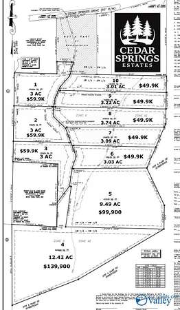 Est $428/moJACKSONVILLE/PLEASANT VALLEY | ACREAGE | CEDAR SPRINGS ESTATES | BEAUTIFUL 3 ACRE +/- level building lot offering scenic country/farm views & conveniently nestled approx 2 miles from Jacksonville State University! These lots are located in the county but restricted for your protection. CEDAR SPRINGS ESTATES will have lots varying in size from approx 3 ACRES to 12.4 ACRES, so if you're looking for an acreage tract that's still near all the amenities, this is neighborhood for you! Pleasant Valley Schools.