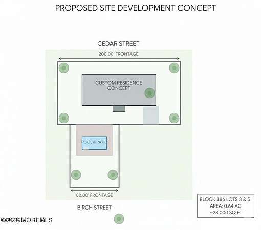An exceptional opportunity to acquire two adjoining parcels of land located off Colts Neck Road in the Farmingdale area. Identified as Block 186, Lots 3 and 5, the combined acreage totals approximately 0.64 acres, with Lot 3 measuring approx. 0.4591 acres and Lot 5 measuring approx. 0.1836 acres. The property offers potential for residential development, which may include a single-family residence or alternative residential concepts, such as townhome or condominium-style development, strictly subject to all municipal, county, and state approvals. No representations are made regarding zoning compliance, permitted uses, density, subdivision approval, buildable area, environmental conditions, wetlands, flood hazard areas, stream buffers, or required variances. Public water and sewer may be available in the area; however, buyer is responsible for independently verifying availability, capacity, connection requirements, and any off-site improvements with the appropriate authorities. The parcels are situated in a convenient location with proximity to local amenities while maintaining a private setting. Per seller, gas, water, and electric utilities are available to the end of Cedar Street and/or Birch Street via Colts Neck Road. Seller also notes that the adjoining parcel is municipally owned, which may limit the likelihood of nearby overdevelopment in the near term. All information to be independently verified by buyers through the appropriate utility providers and municipal authorities. Seller reviewed NJDEP GeoWeb mapping, which does not depict mapped wetlands on the subject parcel based on publicly available NJDEP data. Seller has indicated willingness to obtain a formal wetlands delineation if required. The property is being conveyed as-is, with all certifications, plans, zoning approvals, permits, environmental reviews, and due diligence to be completed solely by the buyer, including confirmation of what may be constructed and where. Disclaimer: All renderings, site plans, and visualizations are conceptual and for illustrative purposes only. They do not represent approved plans or guarantees of buildability. Buyer to conduct all due diligence and obtain any and all required municipal, zoning, and environmental approvals.