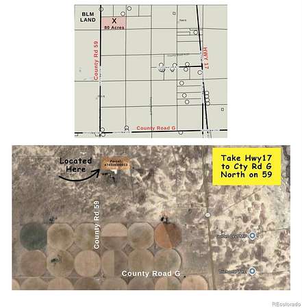 From Alamosa head north on Hwy 17 the west/left on Road G then right on 59 (the sign will have an arrow to left but turn right) then pass two farming circles on the right then follow about similar distance and land is on the right (you will see the green gate on the right, The land is from that south corner of gate and follow north to the north corner before you see the neighbor's driveway). Please do not enter land through gate without an agent.