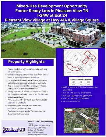 Footer-ready mixed-use lots in the heart of Pleasant View Village, a thriving, master-planned community perfectly positioned between Nashville and Clarksville off I-24 West at Exit 24. With site work completed and utilities in place, these parcels are ready for immediate vertical construction--ideal for investors and developers looking to fast-track their next income-generating project. Located in a well-established area, two of the five commercial lots have already been developed, adding value and stability to the site. The remaining lots offer a rare opportunity to build commercial storefronts with offices and residential rentals above, assisted living within a walkable, village-style setting. ADT: in excess of 12,000 vehicles per day (Hwy 41A)