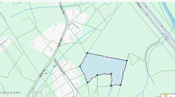 321 turn right on Rocky Branch, turn left on Nebo, Turn left onto Charles Young, Sign on left at house. Enter right of way on driveway to the right side of the garage. Please park and walk up the driveway. You will see where the proper line is marked with paint and stakes at the top of driveway. The paint marks are the neighbors property line. The 25 ft easement is 25ft to the left side of the paint marks on the ground.