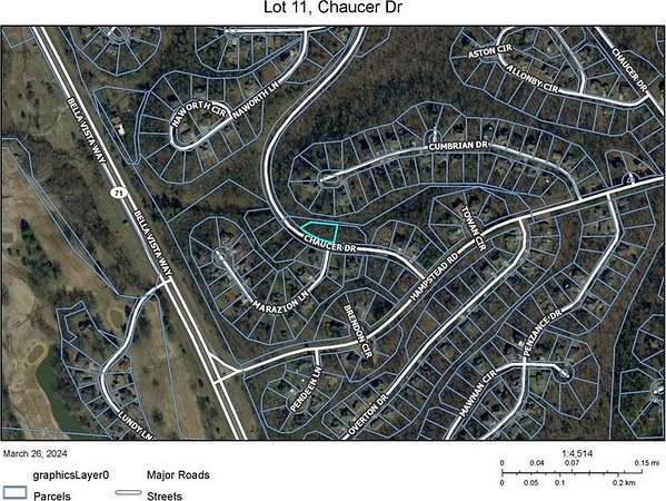 From I-49, go north toward Bella Vista. Take the Hwy 71 exit into Bella Vista. Turn right on Hampstead Rd. Turn left on Chaucer Dr. Lot is on the right. GPS coordinates are 36.491801, -94.258930.