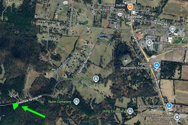 From S Main St in Eagleville, turn west on Cheatham Springs Rd. Drive 1.6 miles and the lot will be on your left, to the south of Cheatham Springs. The property is across the street from 1600 Cheatham Springs Rd. The GPS coordinates are: 35.729, -86.670