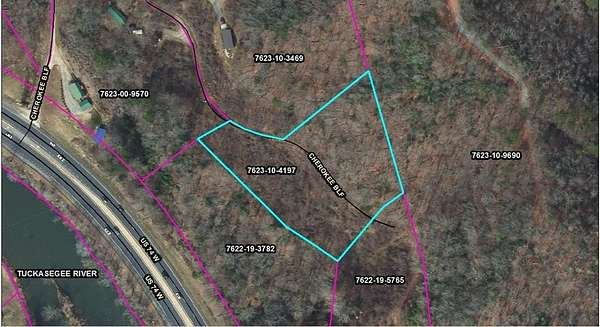 ..........US Hwy. 74 West to Cherokee Bluff (between mile markers 76 & 77) drive in until road forks...go right... house site will be the second road on your right.
