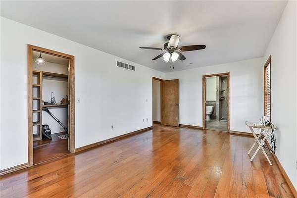 - Ceiling Fan(s), Custom Cabinets, Kitchen Island, Stained Cabinets, Walk-In Closet(s)