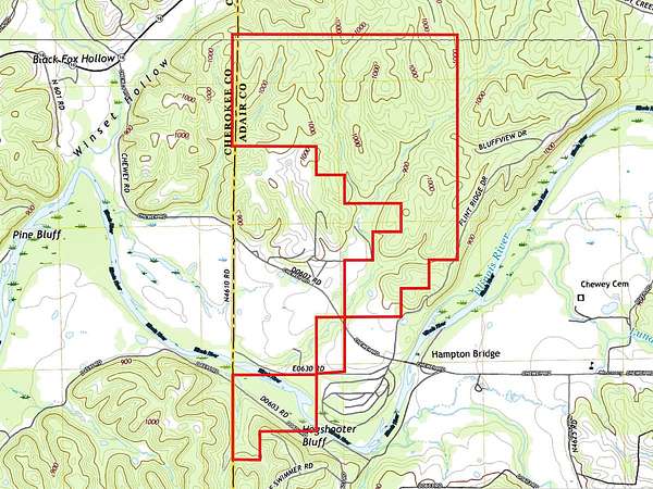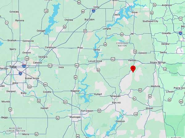 From Tahlequah, head west on W. Downing St. for 2.9 miles. Turn left on SH 10 and continue for 19 miles. Turn right at Chewey Rd. and go 1.6 miles. Turn left on Watkins Holler and go .6 miles. Arrive at property gate.