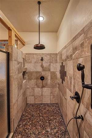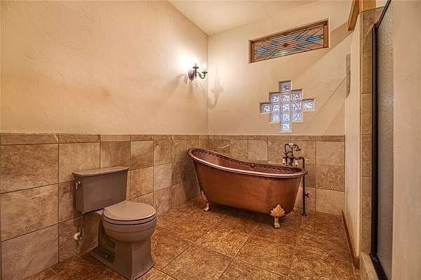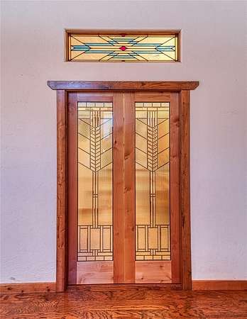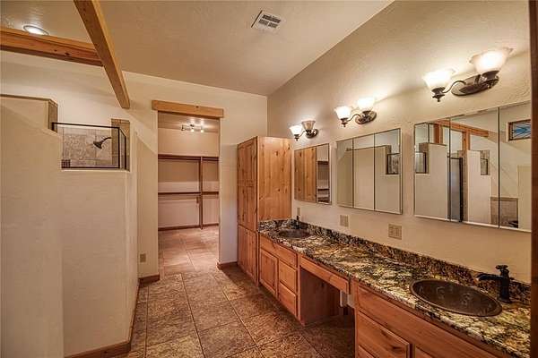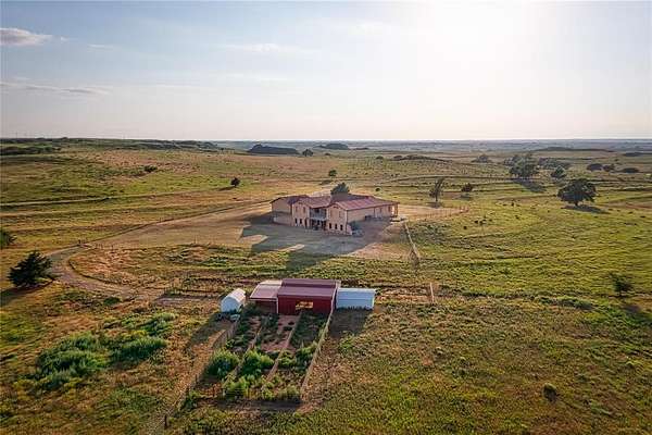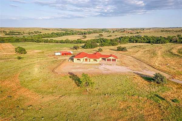 This stunning luxury ranch home offers a blend of elegance, craftsmanship, and outdoor living. Set on nearly 49 acres of picturesque land, this home boasts exceptional custom details that elevate it to a class of its own. Upon entering, you are greeted by warm travertine tile and rich wood flooring that flows seamlessly throughout the open-concept living spaces. Hand-carved wood elements from New Mexico add character and charm, while stained glass features offer a timeless touch. The living room centers around a double-sided rock gas fireplace with a wooden mantel and is also visible from the adjacent home office which features custom-built shelving. The kitchen is a chef's dream, featuring handmade copper sinks, treasure cove granite countertops, and top-of-the-line appliances, including dual dishwashers, double ovens, a 5-burner electric range, microwave, food warmer drawer, and dedicated space for both an ice maker and a refrigerator/freezer. A large pantry with utility hookups offers ample storage. Retreat to the master suite, where indulgence meets tranquility. The master bath features a hand-hammered copper clawfoot bathtub and a master shower with 4 shower heads and a pebble stone floor for a spa-like experience. The large master walk-in closet offers lots of storage, including washer and dryer hookups for ultimate convenience. Step outside onto one of two walkout patios to enjoy the serene views of the surrounding acreage, ideal for relaxing or entertaining. The downstairs area presents incredible potential for customization, with space for up to 5 bedrooms, 3 living areas, a bathroom, and a large safe room. There is also outside access, making it ideal for multi-generational living or guest quarters. The seller had plans to create a workout room, arts and crafts room, and a media/theatre room, offering endless possibilities to personalize the space to your needs. This exceptional property provides the perfect balance of luxurious living and private land.