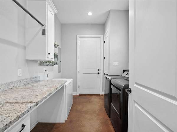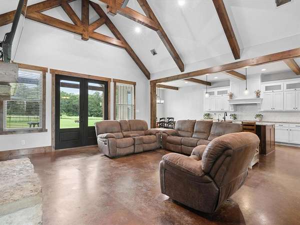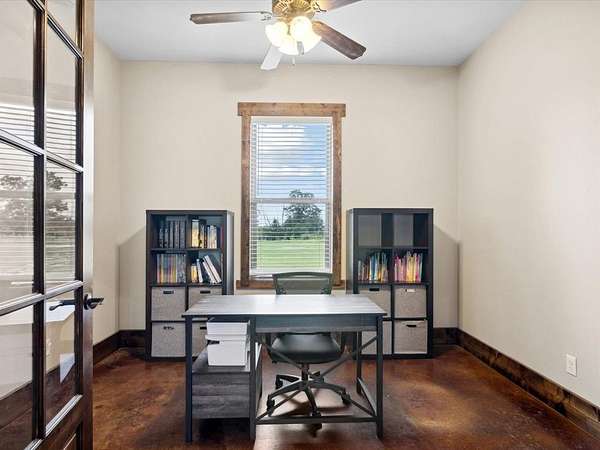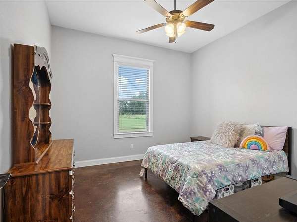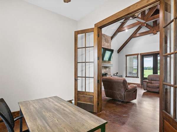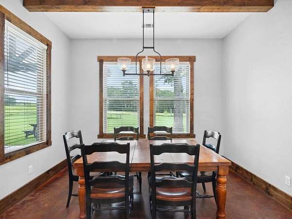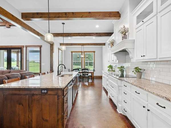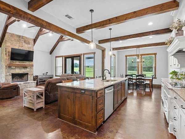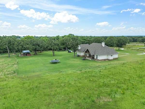 Welcome to your peaceful country retreat! Nestled on 10 beautiful ag-exempt acres just outside of Chico, Texas, this stunning 3-bedroom, 2-bathroom traditional-style home features timeless stone and board-and-batten accents with modern comforts throughout. Conveniently located with quick access to Decatur and major shopping, you'll enjoy the perfect blend of quiet country living and nearby amenities. Step inside to find an open, airy floor plan with stained concrete floors flowing seamlessly throughout the home. The spacious living room boasts rich stained wood beams and a cozy wood-burning fireplace, creating the ideal space to relax or entertain. The large kitchen is truly a showstopper, featuring stainless steel appliances, granite countertops, a massive island perfect for hosting, and a huge walk-in pantry. The oversized laundry room offers ample space for a full-size washer and dryer, extra refrigerator and freezer, plus built-in cabinets and countertops for added functionality. The private primary suite is a true retreat with a luxurious soaking tub, walk-in shower, dual vanities, and a generous walk-in closet. Two additional bedrooms are tucked away on the opposite side of the home in a desirable split-bedroom layout. A dedicated office just off the living room provides the perfect work-from-home space. Enjoy peaceful country mornings and quiet evenings from the large covered back porch, surrounded by wide-open views and the sounds of nature. Additional features include a water softener, reverse osmosis system, and two hot water heaters. Built in 2019 and currently used as a productive hay field, this property offers a rare combination of modern living and ag-exempt status. Don't miss your chance to experience everything this beautiful home has to offer--schedule your showing today!