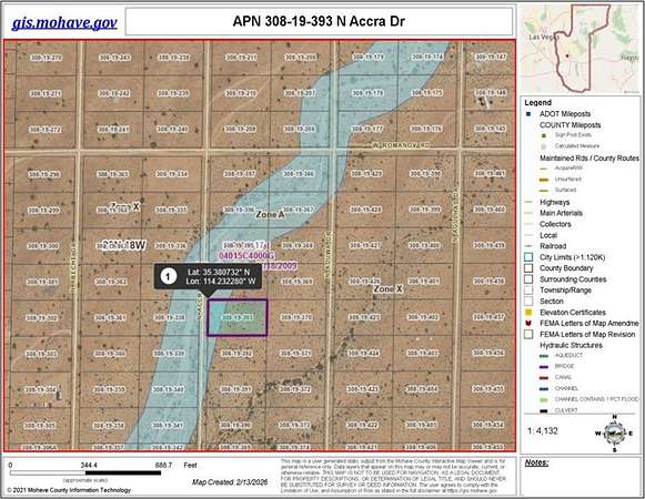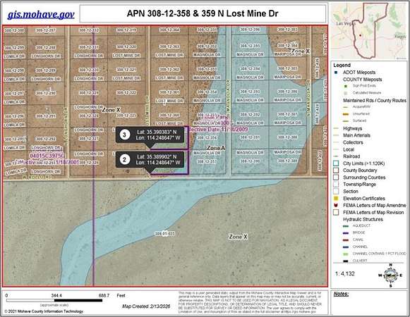 Some roads are soft, AWD is recommended. To APN 308-12-358 & 359 N Lost Mine Rd, From Kingman head north on Hwy 93. Exit W Chloride Rd. Right on N Roosevelt Rd. Left on W Rollo Rd. Lots are on the corner of W Rollo Rd and N Lost Mine Dr. To APN 308-19-3963 N Accra Dr, From Kingman head north on Hwy 93. Exit W Chloride Rd. Right on N Colorado Rd. Left on W Romanov Rd (unmarked). Right on N Accra Dr (unmarked). Lot is on the left.