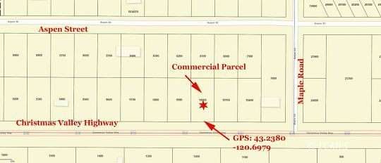 Est $140/mo.28 Acre Lot Zoned Commercial with Christmas Valley Highway road frontage, power, phone, community water, and fiber optics for internet are all available. The parcel is flat with a very light brush cover. Ready to be developed. This parcel has exceptional Highway access and exposure. Situated nicely with the dollar store, hardware store, and tractor stores, all just across the road and in the general area. This is priced to sell quickly. No Owner Carry.