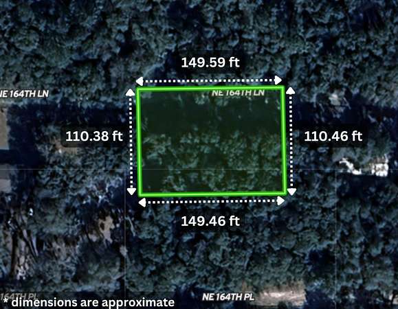 The property features direct access via NE 164th Lane, a county-maintained dirt road, with a functional rectangular layout measuring approximately 149 feet by 110 feet at roughly 60 feet elevation. Located in the Meadows Unit 2 subdivision outside city limits, the mostly level wooded terrain allows selective clearing for driveway placement and home layout while maintaining natural privacy and you can keep the trees you'd like for shade and privacy.
