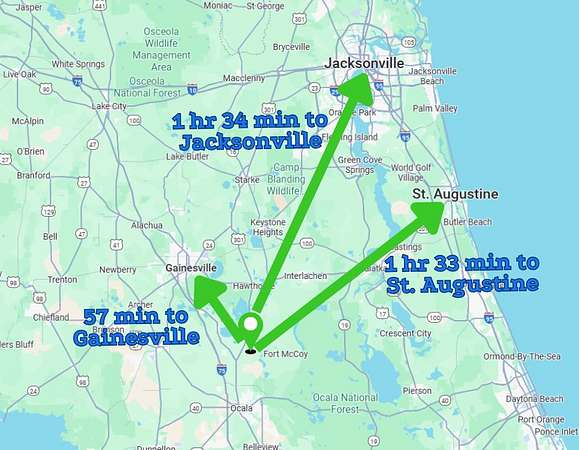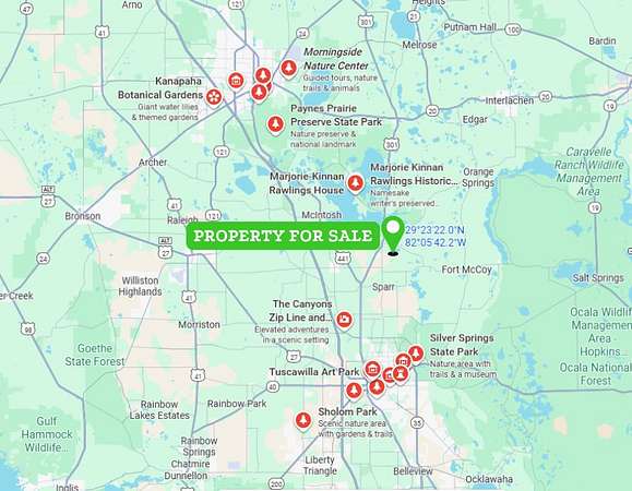 Located just around the corner from US-301 and 38 minutes from Gainesville, the property provides easy access to Citra for basic services and fuel. Marion County's central position places owners nearly equidistant to Jacksonville, Orlando, and Tampa--offering straightforward access to major Florida airports, employment centers, universities, and both Atlantic and Gulf coasts. Nearby attractions include Marjorie Kinnan Rawlings Historic State Park and The Canyons Adventure Park.