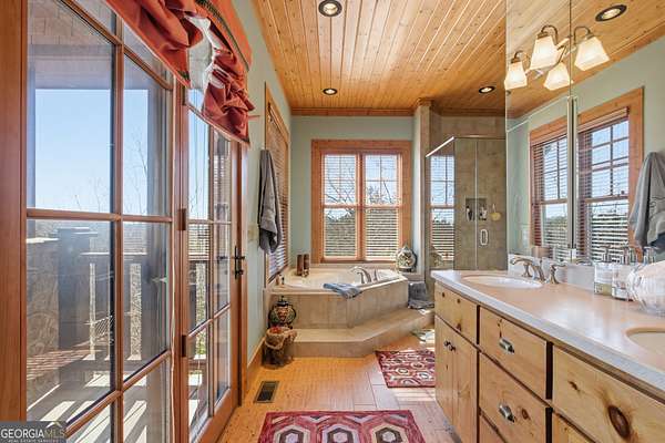 - Beamed Ceilings, Double Vanity, High Ceilings, Master On Main Level, Separate Shower, Soaking Tub, Tile Bath, Vaulted Ceiling(s), Walk-In Closet(s), Wet Bar