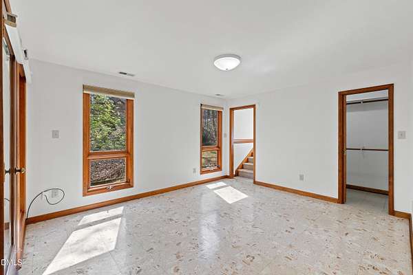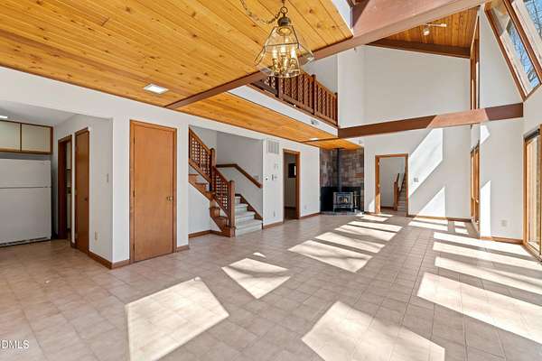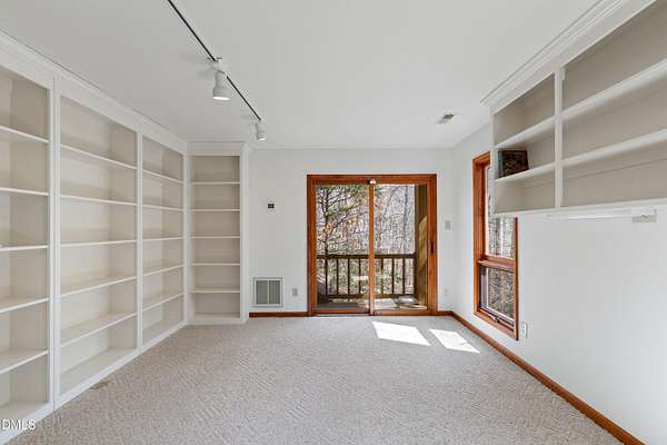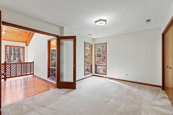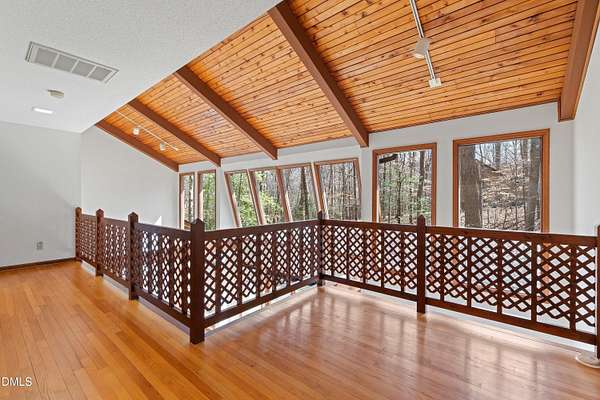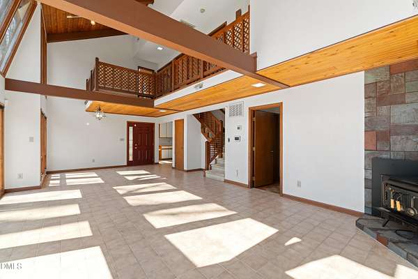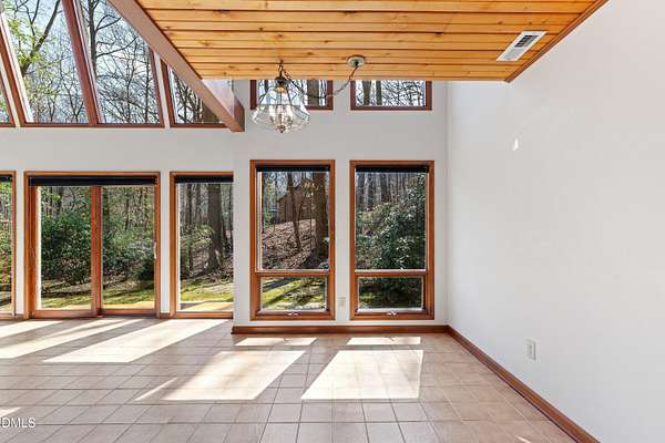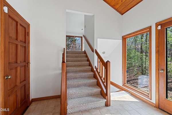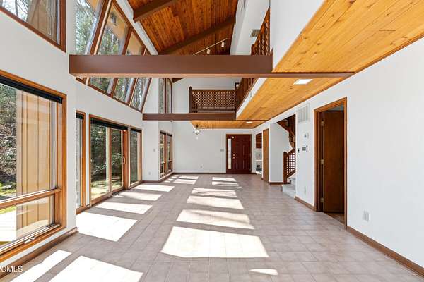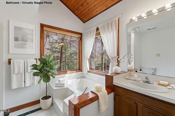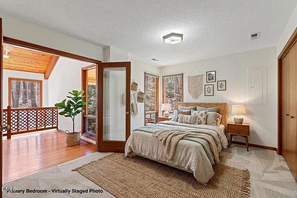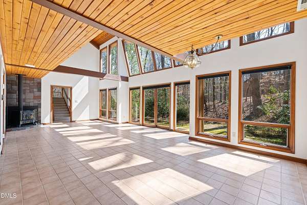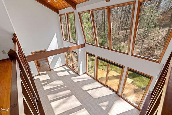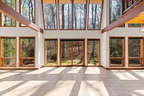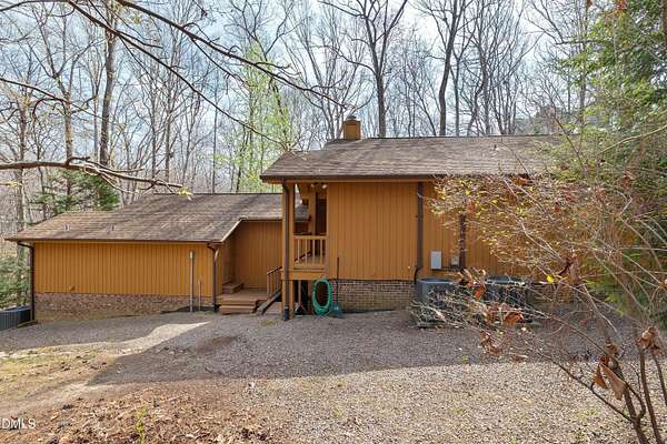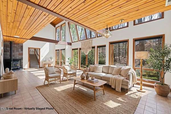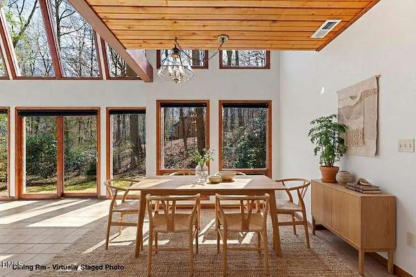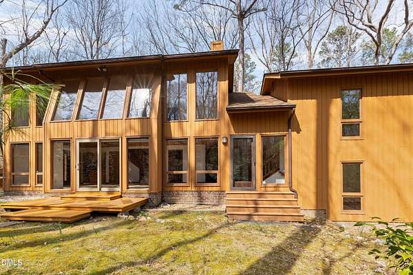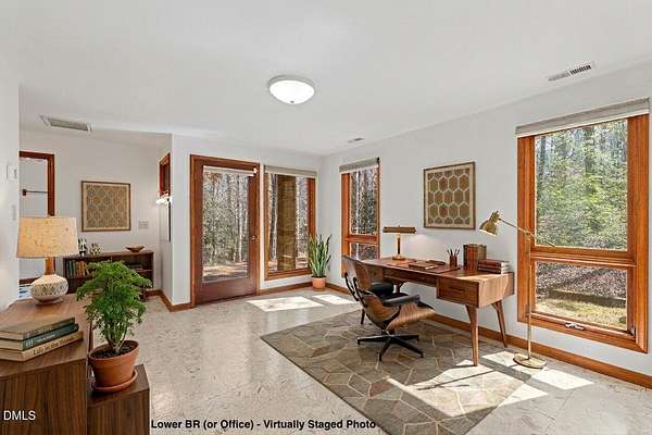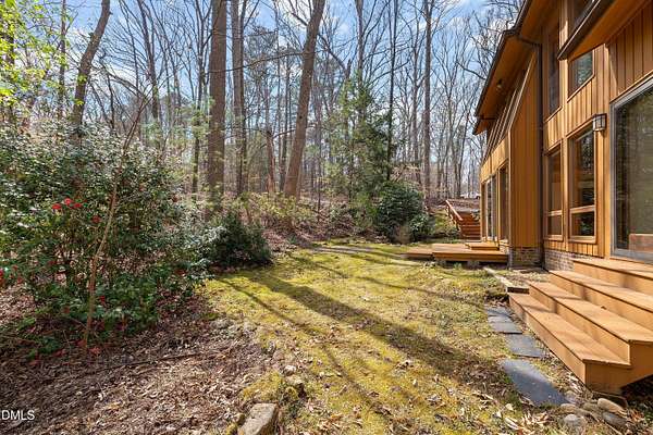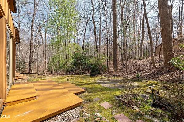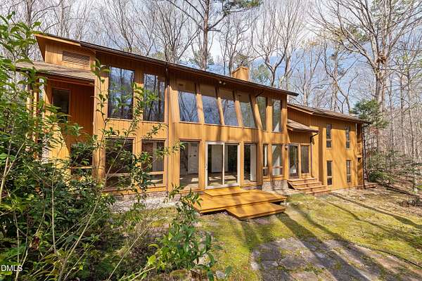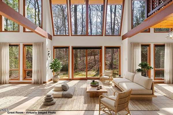 RARE WALDEN OPPORTUNITY! - One of a Kind, Organic Woodland Retreat! Set within 1.52 sprawling acres of hardwood forest, this architecturally distinctive deck house is designed to participate with nature, creating a home where light, landscape, and structure exist in quiet harmony. The land gently slopes to a flowing stream with a waterfall, forming a serene, Walden-like setting of wildflowers, birds, and abundant wildlife. Spanning 3,065 square feet, the home embraces its surroundings with natural materials, expansive glass, and thoughtfully oriented spaces that invite the outdoors in. At the heart of the home is a dramatic two-story great room with tile flooring and floor-to-ceiling windows that frame the forest's changing seasons. Winter sunlight fills the space while the surrounding hardwood canopy provides welcome shade in summer, creating a naturally comfortable environment year-round. Throughout the home, decks and balconies extend the living spaces outward, offering ever-changing views of woods and wildlife and reinforcing the connection between the house and its landscape. Interior features include: - Library with built-in shelving and storage - Wood-stove fireplace in the great room - Loft overlooking the great room - Three sliding glass doors opening to outdoor living spaces - Very private primary suite - Three walk-in closets - Pantry and utility room off the kitchen - Track and recessed lighting - Smooth ceilings in the library, foyer, and primary suite Additional features include: - Cedar siding exterior - Whole-house attic fan - Security system - Two storage sheds (attached and freestanding) - Paved driveway on a quiet cul-de-sac - All-electric systems The surrounding neighborhood features rustic walking trails winding through the woods, complementing the home's peaceful woodland setting. A rare opportunity to live in a home that blends architecture and landscape into a single, harmonious experience. *Some photos have been AI staged*