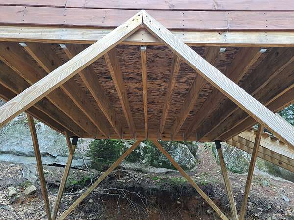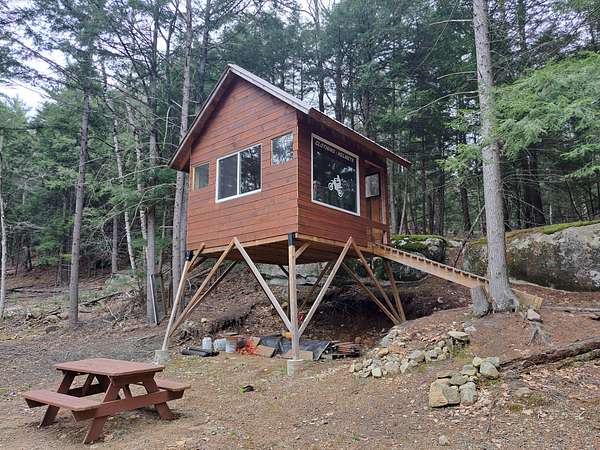 A "Grown-Up" tree fort was built in 2020. It is a 12' x 12' elevated structure, backed up to a small rock outcropping. It remains unfinished but is sided and has a steel roof and windows. With a fire ring already in place, it would make for a unique camping spot, in a picturesque forest setting, yet so close to town.