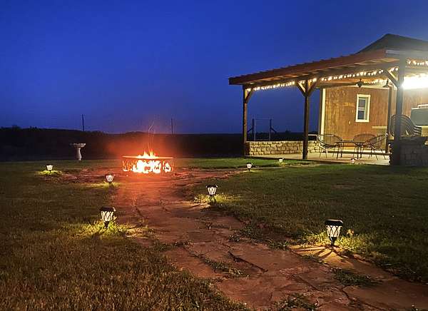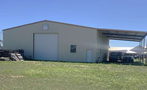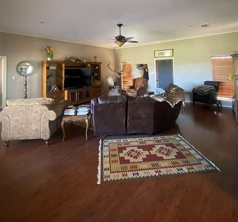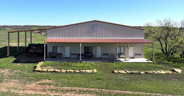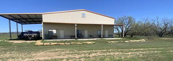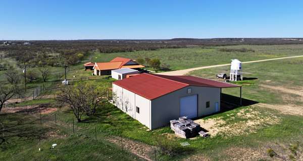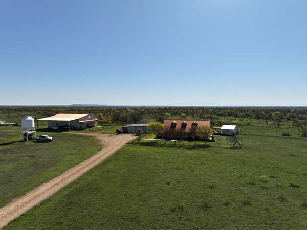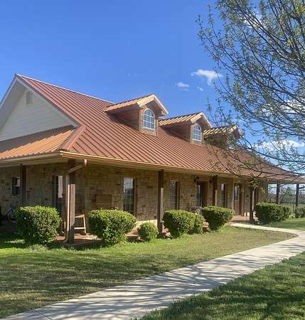 There is a 2166 sq foot home located on this Texas game ranch for sale. Complete with a 3 bedroom 2.5 baths sandstone rock home with a metal roof. This home was built in 2009 and features an open, split floor plan with custom island kitchen, wrap around porch. A nice outdoor kitchen is featured in the backyard, perfect for entertaining. A 2 car garage or shop is located next to the home.