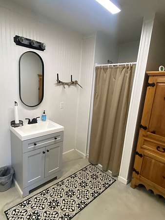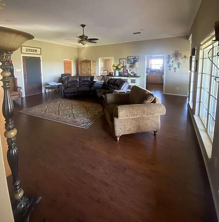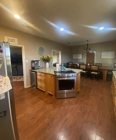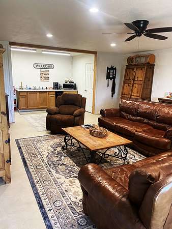 There is a 60 x 60 metal shop building with one end consisting of 1350 sq ft of living area. The living area boasts of 3 rooms total with 2.5 bathrooms. 2 rooms sleep around 6 each with room for more. Full bathroom in each of the sleeping quarters. The main room or common area provides room for conversation, a small kitchen complete with a refrigerator, stove, and sink. This room also includes a 1/2 bath.