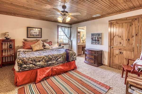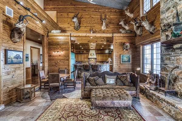 The centerpiece is a two story rock home set high with sweeping views across the ranch and the lake. Built in 2002, the home is approximately 6,000 square feet per owner and features 5 bedrooms and 5.5 bathrooms. The garage enters into an oversized mud room and laundry room, the main living area is anchored by a rock fireplace and expansive windows, and upstairs includes 3 bedrooms, a game room, a media room, and a balcony. The home is supported by three newer air conditioning units.