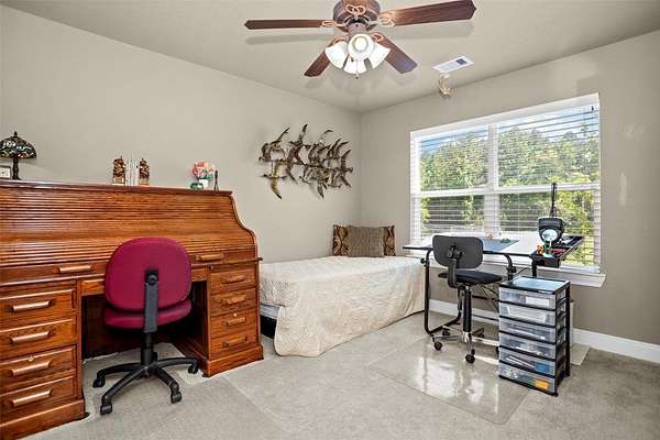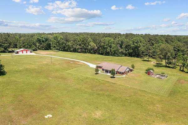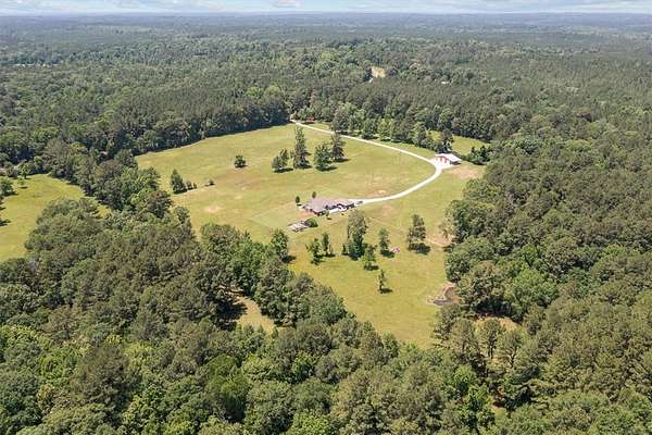 This stunning custom home boasts 4 bedrooms and 2.5 baths, on over 51 unrestricted acres. Two tranquil ponds, vast pasture land & natural forest, the property features the perfect blend of nature with plenty of privacy. Bean Creek runs along the southern border, along with seasonal creeks all enhancing the picturesque setting and welcoming to local wildlife. There is a charming front porch & a back patio & deck area. Step inside to discover custom finishes throughout the kitchen & baths, as well as a dedicated library & home office, ideal for remote work or quiet reading. The expansive grounds feature a 3-car garage with an additional work area. A 30'x50' 3-bay shop on concrete slab w/RV & boat storage as well as 2 overhangs for equipment. There is a fenced garden area with a gardening shed equipped with water and electricity. This move-in ready sanctuary combines luxury and rustic charm, making it an ideal retreat for families or those seeking a peaceful lifestyle.
