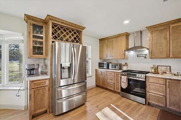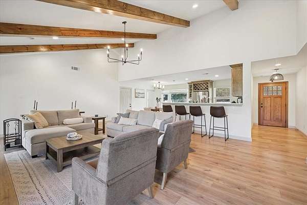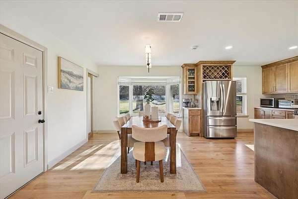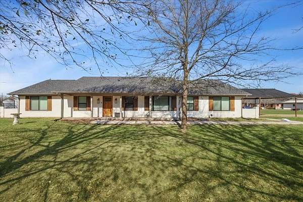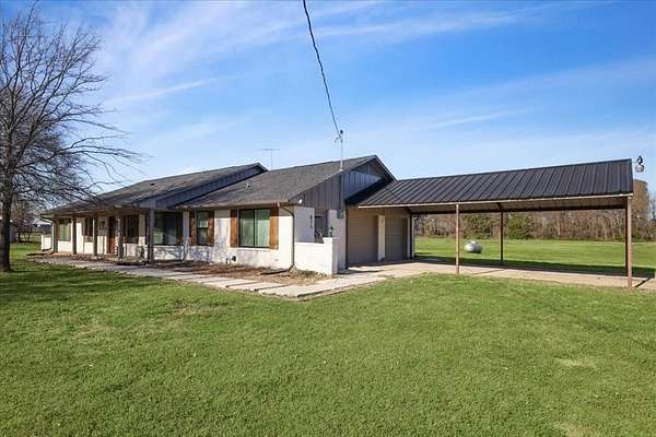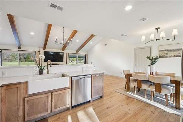 Situated on 2.5 acres on a corner lot with no HOA, this property offers spacious living, extensive updates, and flexible use options. Recent improvements include a new roof and a new septic system. Interior features include vaulted ceilings with exposed wooden beam detail, custom-stained kitchen cabinetry, and a spacious laundry room with additional custom cabinetry for storage. The primary suite offers separate walk-in closets and a dedicated vanity area. Exterior highlights include an extended concrete patio, two-car garage, covered carport with space for up to four additional vehicles, and a separate 20 x 30 workshop with an automatic garage door opener. Located in a semi-rural setting with acreage and functional outbuildings, this property offers space, storage, and versatility.