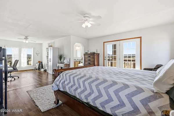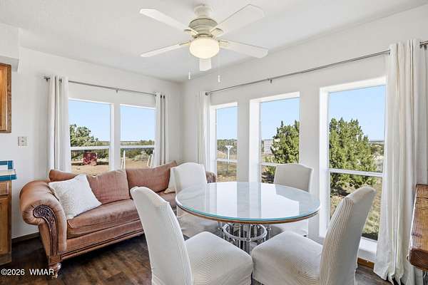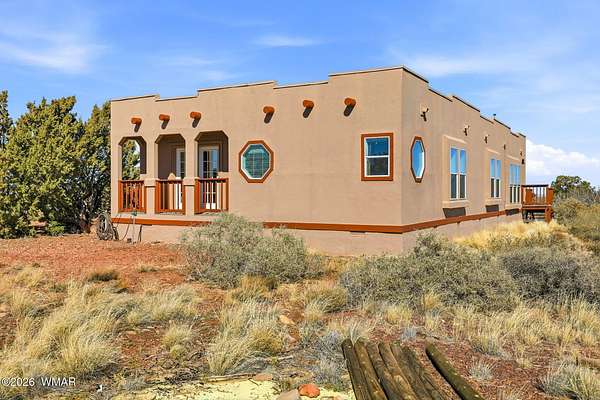 Off-grid living with phenomenal southern views in this charming Southwest-style home. The landscaped garden area sits below the home and is equipped with irrigation for easy growing. A bonus 40' container with an adjacent pit was originally designed as a root cellar and offers flexible potential for a pond, underground greenhouse, or shelter. Additional outdoor features include a chicken coop, well house, and storage shed. Inside, enjoy a remodeled interior with a cozy wood stove, large windows framing the stunning views, and a spacious primary suite featuring a soaking tub, walk-in shower, and private deck. A versatile bonus room offers space for a potential third bedroom or office. Located approx. 25 mins from Snowflake, at an elevation of around 5600 ft. State land very close by.