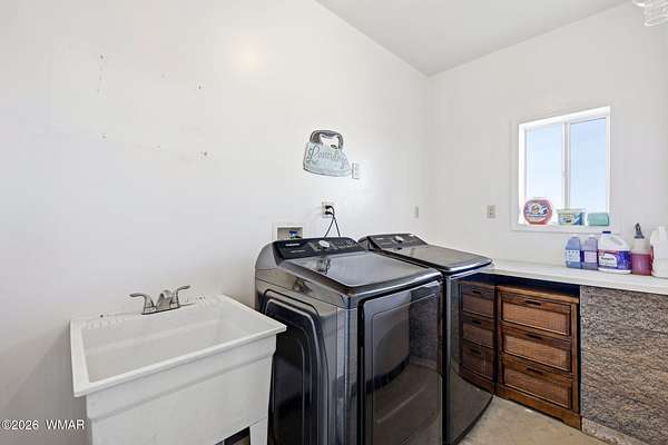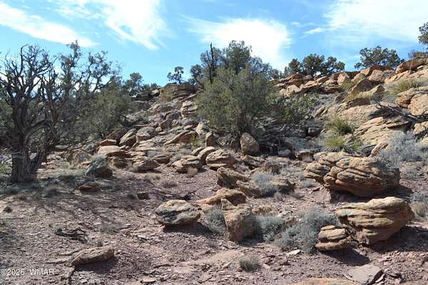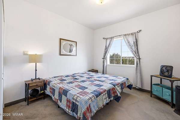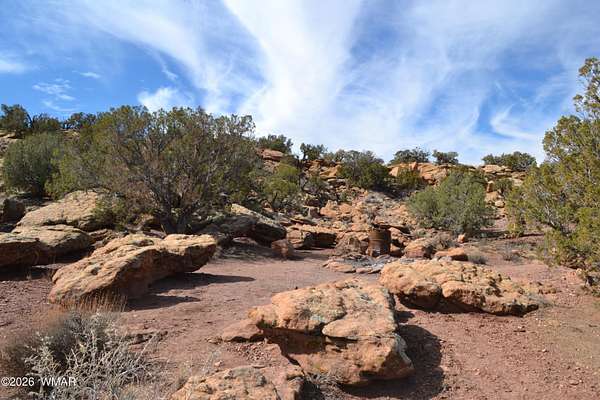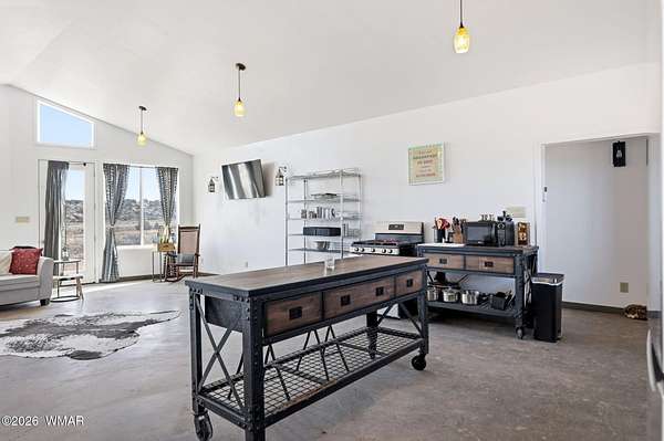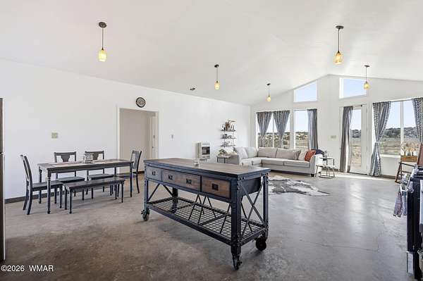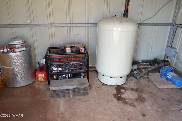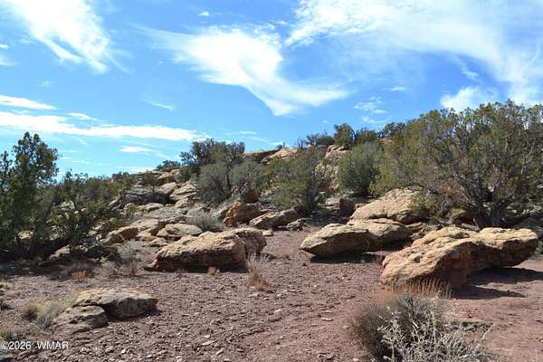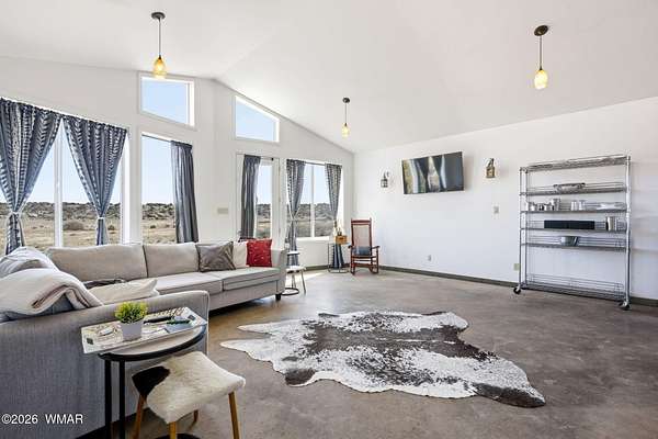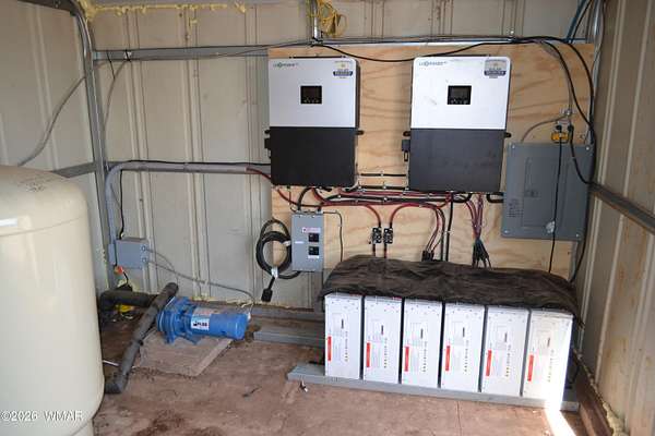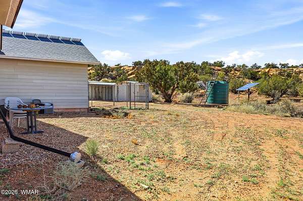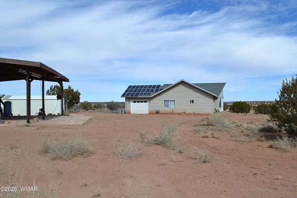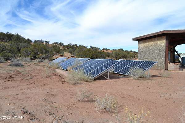 Located approx. 20 miles from Snowflake, this 44-acre property offers breathtaking views and dramatic rock formations to the west. The upgraded solar system includes 24 x 800-watt panels, two 6,500-watt inverters, six lithium-ion batteries, and a 9,000-watt backup generator. The well features a newer solar pump, 2,500-gallon storage tank, jet pump, and pressure tank. The home offers a spacious great room, two bedrooms, two baths, and an attached one-car garage. Two storage sheds, a large open workshop, and dog runs add versatility. Fenced to the rock outcroppings. Enjoy four seasons at 5,700 ft elevation. Internal photos will be added by 2/24/26