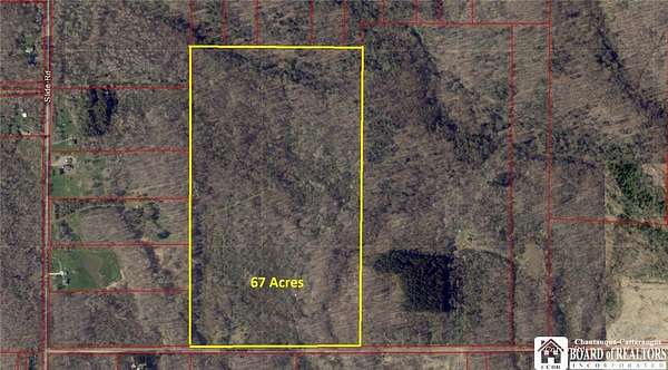Discover the perfect blend of seclusion, natural beauty, and recreational opportunity with this rare offering of approximately 67 rural acres in the Town of Ellery. Tucked away in a peaceful country setting, this property is ideal for outdoor enthusiasts, builders, or anyone seeking a private escape. The land is predominantly wooded, featuring a rich mix of mature trees, rolling terrain, and abundant wildlife-perfect for hiking, hunting, or simply enjoying nature. A picturesque pond sits along the roadside on the western corner of the property, while a creek runs along the easterly corner. A dirt driveway is already in place, leading to a cleared area that provides an excellent starting point for a cabin, camp, or future home. Whether you're visioning a weekend getaway, off-grid living, or long-term development, the groundwork is ready. Electric pole on neighboring property. Located in the town of Ellery, you'll enjoy the tranquility of rural living while still being within a short drive to Chautauqua Lake, local amenities, and year-round recreational attractions.