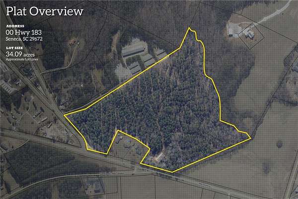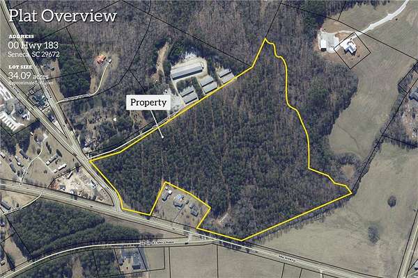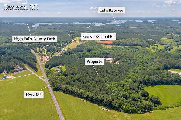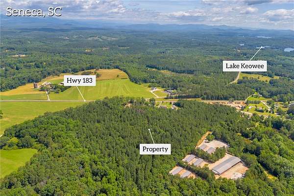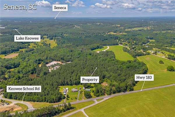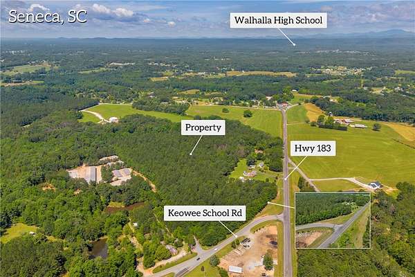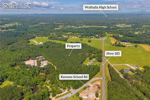 This rare offering features over 34 unrestricted acres with more than 500 feet of frontage on Hwy 183 and over 400 feet on Keowee School Road, including the prominent corner. Ideally situated just minutes from Lake Keowee, downtown Seneca, Keowee Elementary School, and Walhalla, the property boasts excellent topography with the potential for mountain views from its higher elevations. With city water available and mature timber in place, the land offers an ideal setting for residential estates, commercial ventures, or larger-scale development. The combination of high-visibility road frontage and depth into the property creates both accessibility and privacy, making it an exceptional opportunity for those seeking space without sacrificing location. A scenic creek runs along the rear boundary, adding to the natural appeal of the land. Whether for investment, development, or a private retreat, this property is a must-see.