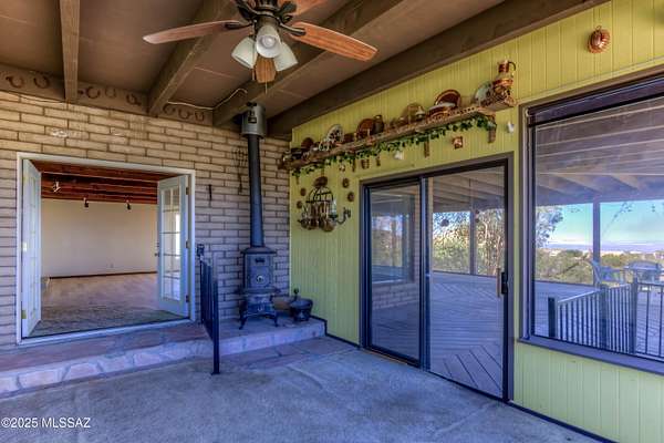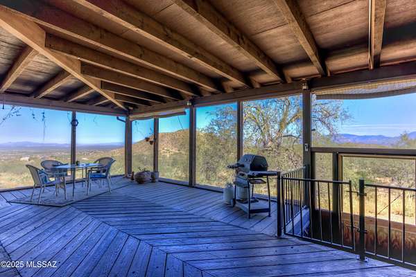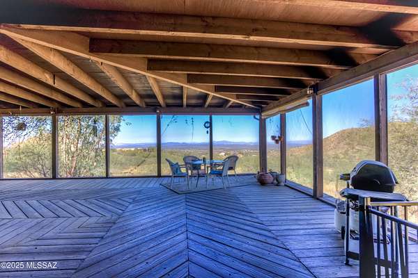 Amazing home on 20 acres is nestled in the Santa Foothills with lush Sonoran Desert adjoining the Coronado National Forest. Over 4000' elevation with panoramic views of mountains, sunsets and city lights. Solid masonry construction with expansive wrap around screened-in porch with wood burning stove and billiard area. Large living room with high wood beamed ceiling, fireplace and picture windows accessible from front entry and kitchen. Open family room lead to bedrooms. Huge walk-in pantry, Lots of storage area including the basement. Primary bedroom has private large covered patio. Laundry room also has shower stall. 3-car garage with work benches. 20 Acres includes Two parcels, home on 5 acres and adjoining 15 acres with many beautiful building sites. Plenty of room to expand. Zoning allows for one house per 5 acres. Solid masonry construction and needs a little TLC and updating and well worth it! Tucson City Water is delivered to the property through the Mount Fagan Water Coop. Two extra storage buildings stay.