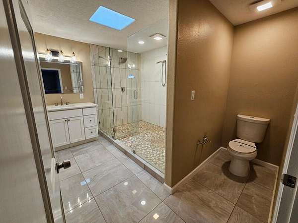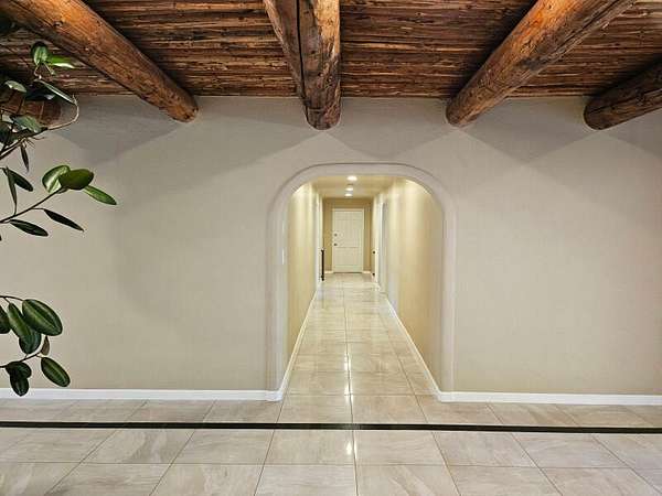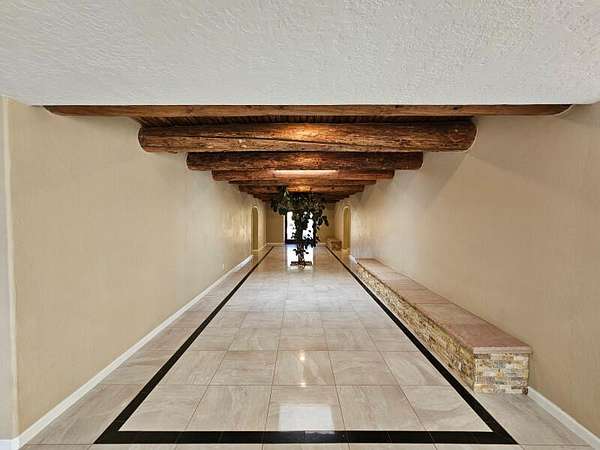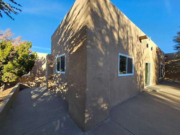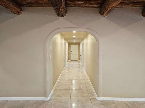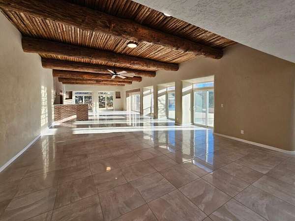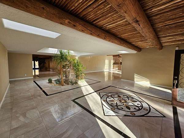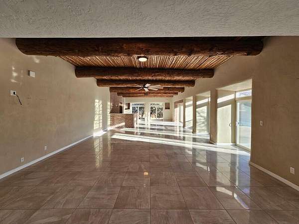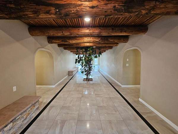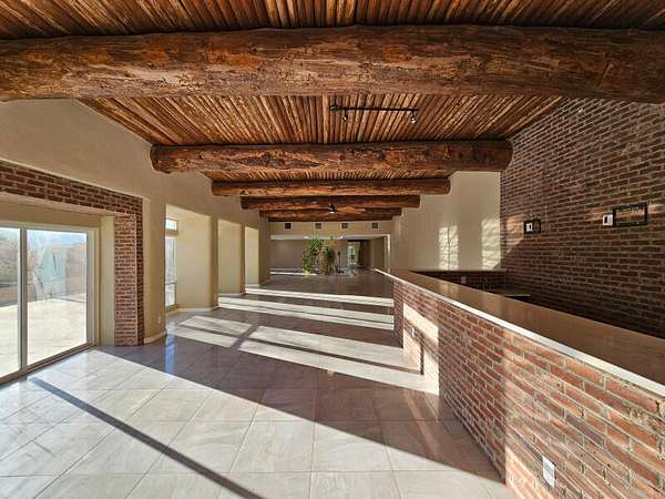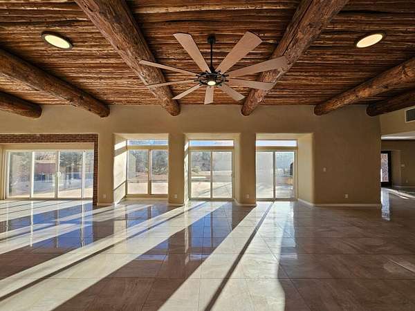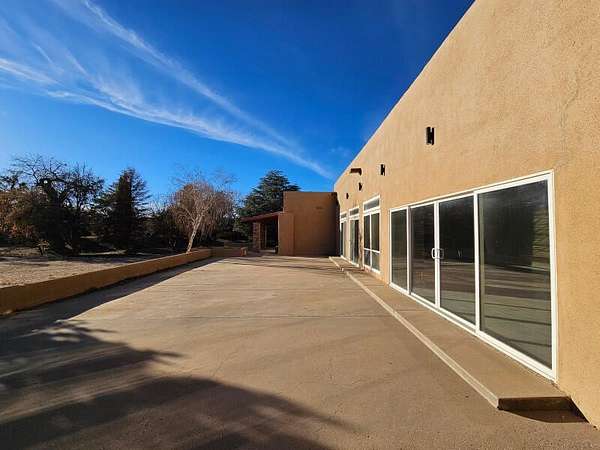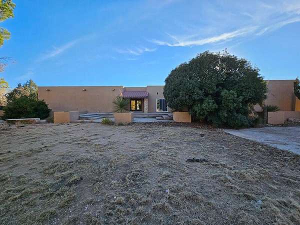 Located behind secured gates on 2.51 acres, this contemporary property offers privacy and close proximity to the Corrales Bosque and the Rio Grande River. The entry atrium includes an indoor garden and a large skylight providing natural light to the space. The main living area features a built-in bar and a wood-beamed ceiling crafted with beautiful custom detail. The kitchen includes custom cabinetry and countertops, a commercial-grade range, oversized pantry island with seating area and additional modern finishes. The owner's suite includes a fireplace and a bathroom with dual sinks a freestanding tub integrated with the shower area, and an amazing walk-in closet. Detached casita with 2 bedrooms and 2 bathrooms and not to mention a pool - (pool needs work). This home is a must see!