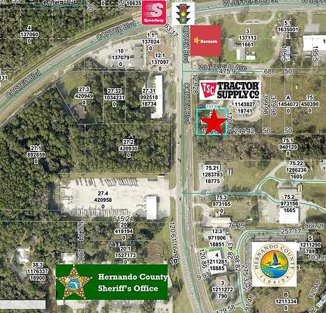 The lot sits directly in front of Tractor Supply and south of Hardees Fast Food at 18741 Cortez Blvd, Brooksville, FL 34601, and just north of Hernando County Sheriff's Office and Hernando County Building, Planning and Zoning offices. Great location for a quick serve food or quick serve auto business. Located in the City of Brooksville.