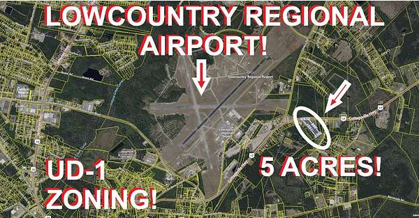ATTENTION BUSINESS OWNERS / INVESTORS / DEVELOPERS!! --- OVER 5 ACRES!! HIGH AND DRY LAND READY FOR DEVELOPMENT!! Right around the corner from the LOWCOUNTRY REGIONAL AIRPORT!!! --------------THE SKY IS THE LIMIT HERE!! ------------ ZONING allows for almost anything! ------------------ See attached Permitted Uses for ZONING UD-1 --------------- (Large variety of Commercial, Multi-Fam, Rentals & Residential Development!) At this price, a short-term investment will pay for itself!! HURRY!! (SEE MORE) --- GO & SHOW - NO APPT NECESSARY